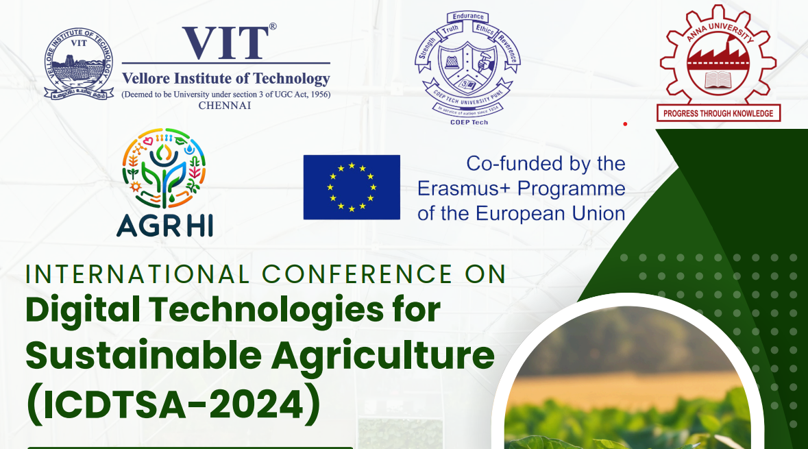 The International Conference on Digital Technologies for Sustainable Agriculture (ICDTSA- 2024) is organized by Vellore Institute of Technology, Chennai, under the framework of AGRHI project sponsored by Erasmus+. Co-organized by Anna University, Chennai, and College of Engineering, Pune, the conference serves as a platform for scholars, practitioners, educators, industry professionals, and agricultural entrepreneurs to exchange knowledge, enhance practices, and stimulate innovation in sustainable agriculture. Additionally, it aims to foster a collaborative and interdisciplinary environment where researchers from diverse fields can connect agriculture with sustainable development. The conference features plenary sessions, poster presentations, interdisciplinary dialogues with international experts, and specialized tracks for original research articles, providing participants, with opportunities to exchange ideas, innovations and practical knowledge.